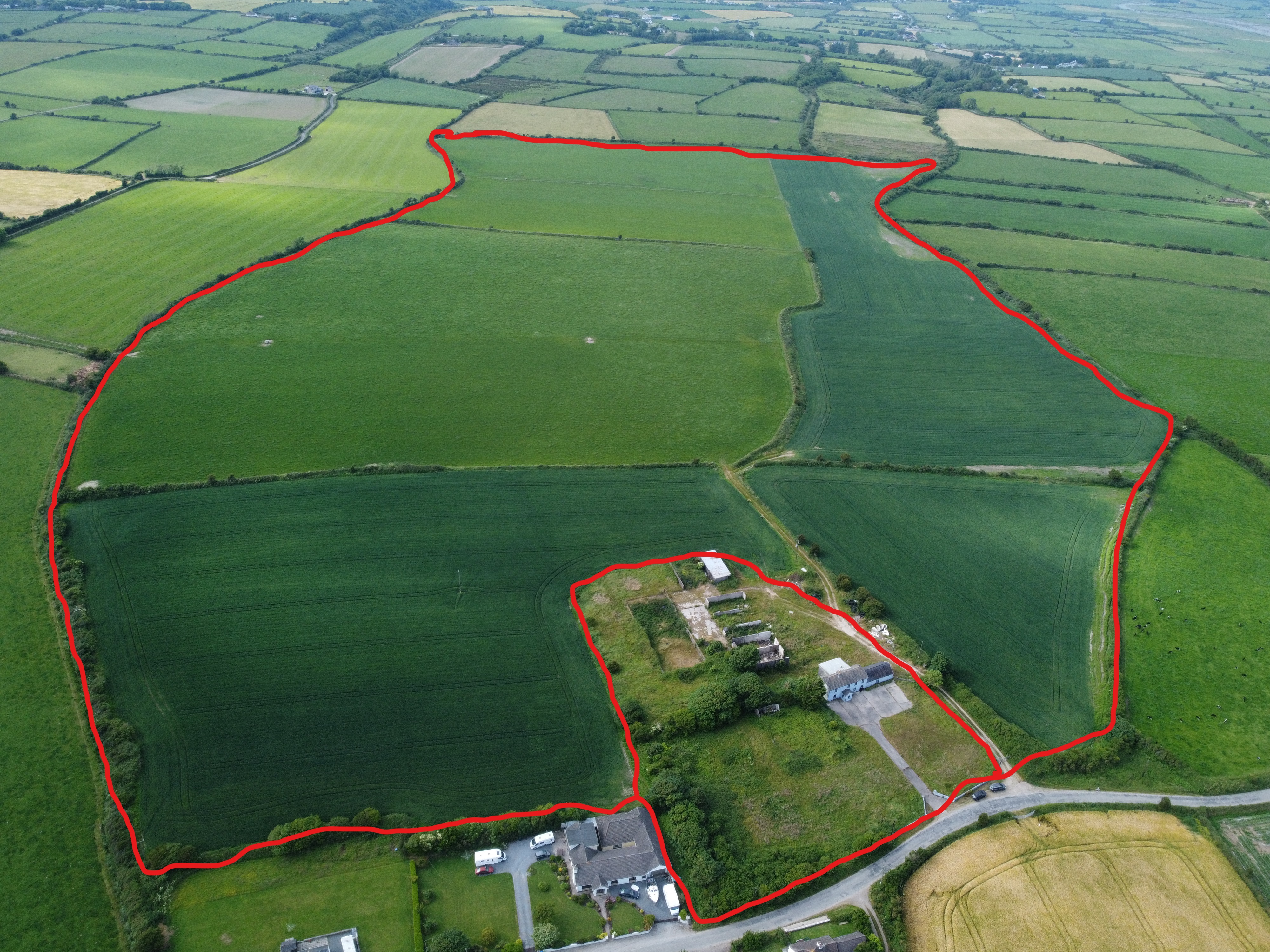 Approx. c22 acres in one or two lots Lot 1 Prime roadside land is all in one field with no waste. Suitable for all types of farming. c21 acres approx with enclosed modern farm shed Lot 2 5 bedroomed bungalow, about 8 years old, (in need of completion) on approx. c1 acre |